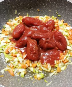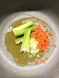 3) Tritate la cipolla, la carota e il sedano e fateli appassire per 5 minuti con l’olio a fiamma vivace.