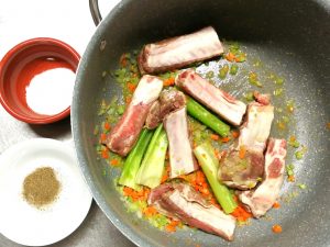 1) Tritate la cipolla, la carota e il sedano e fateli appassire per 5 minuti con l’olio a fiamma vivace. Unite le spuntature di maiale e fatela rosolare nel soffritto, salate e pepate.