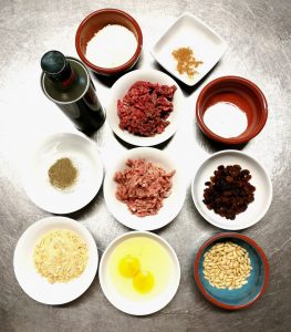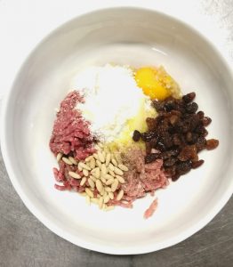 1) Iniziamo la preparazione di queste polpette, unendo tutti gli ingredienti in una ciotola: carne macinata, pinoli, uvetta, parmigiano, uova, sale, pepe e noce moscata. Impastare il tutto e creare le polpette.