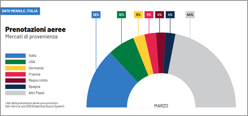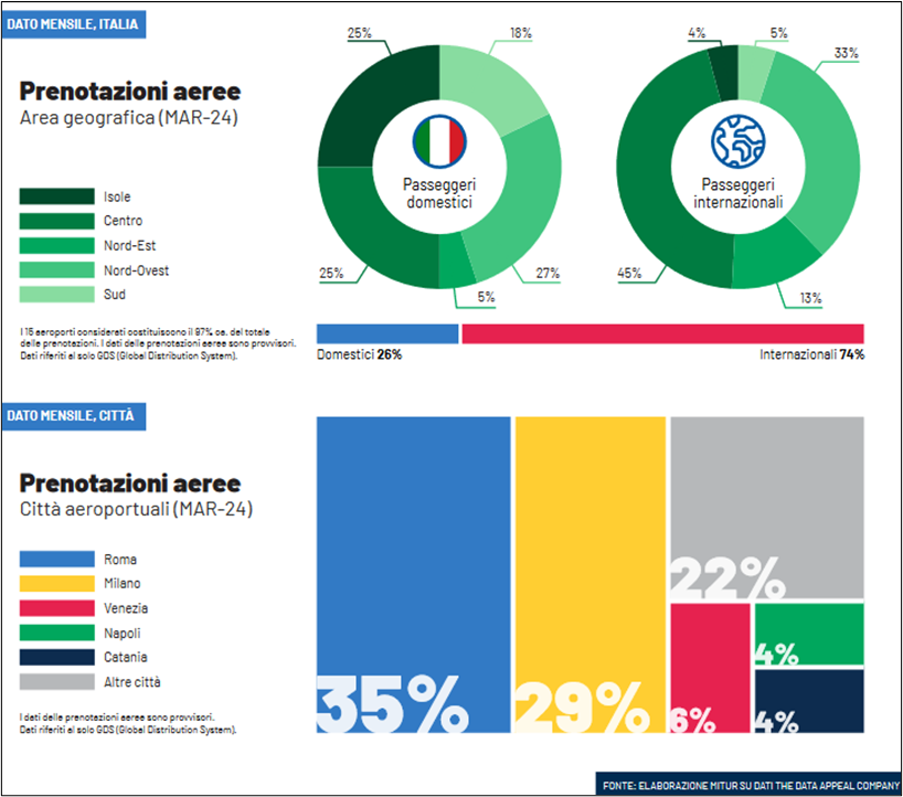 I passeggeri internazionali rappresentano i tre quarti delle prenotazioni aeree complessive e, di questi, quasi la metà ha come destinazione il Centro Italia. I passeggeri domestici si distribuiscono tra il Nord-Ovest, il Centro e le Isole. Tra i principali hub aeroportuali, Roma (35%) e Milano (29%) sono i più scelti dai turisti per raggiungere l’Italia.