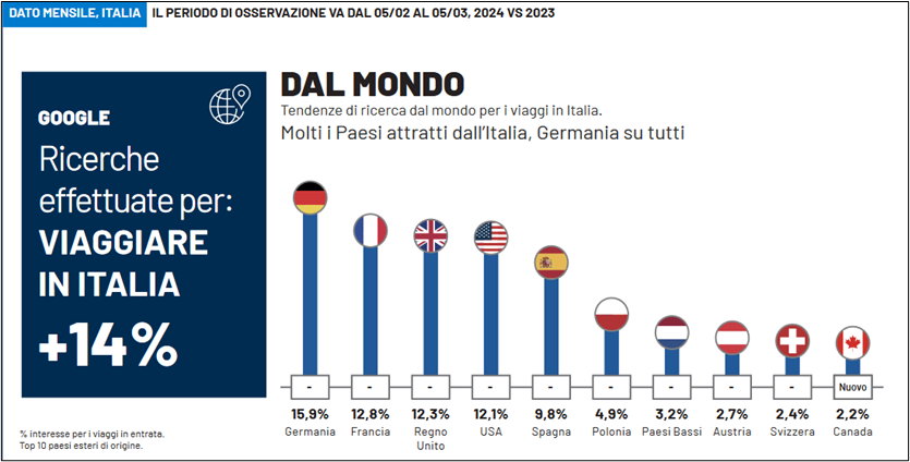 Aumentano del 14% le ricerche su Google per “viaggiare in Italia” rispetto allo stesso periodo di osservazione (5 febbraio-5 marzo) dello scorso anno.