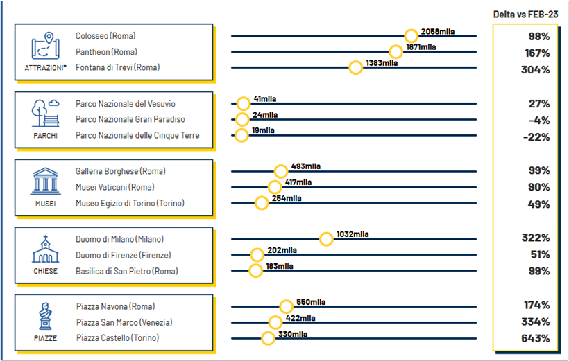 A febbraio 2024 il Colosseo si conferma l’attrazione turistica italiana più ambita con quasi 2,1 mln di ricerche. Piazza Navona, la Galleria Borghese e il Parco Nazionale del Vesuvio sono rispettivamente la piazza, il museo e il parco naturalistico più ricercati dagli utenti. Tra le chiese spicca per distacco il Duomo di Milano con oltre 1 mln di ricerche (+322% vs ’23). Rispetto ai mesi precedenti si osserva come alcune attrazioni della città di Torino abbiamo suscitato l’interesse dei turisti rientrando tra i luoghi più ricercati: Piazza Castello – che segna l’incremento più rilevante (+643% vs ‘23) – e il Museo Egizio.