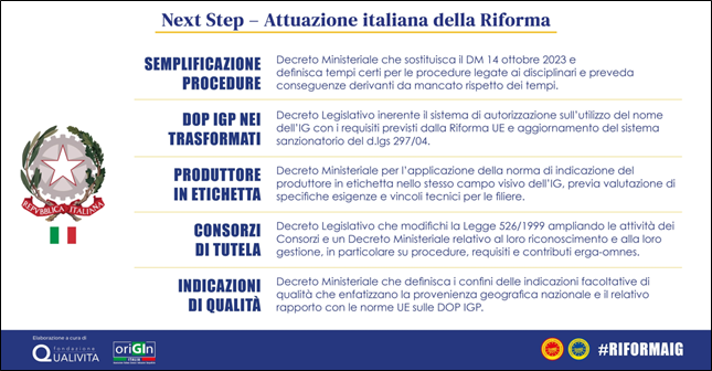 Dopo l’entrata in vigore del nuovo Regolamento si aprirà una fase legislativa e amministrativa per l’adeguamento della normativa di settore funzionale allo sviluppo delle potenzialità del sistema nazionale. Il Sistema Italiano deve poter beneficiare di strumenti efficaci e adeguati al fine di favorirne la crescita e l’affermazione delle filiere e dei Consorzi di tutela, anche in ottica della nuova competizione globale.