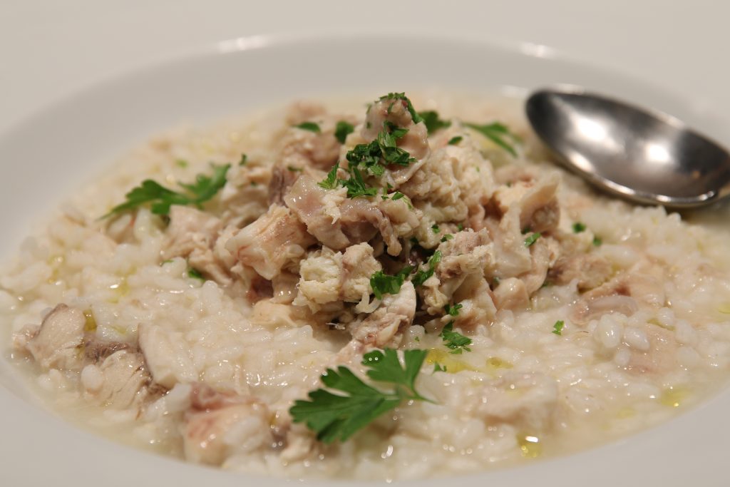 Passare il brodo attraverso un colino a maglie fini e aggiustare di sale se necessario. Cuocerci il riso e servire, una volta cotto, su fondina con un filo di olio a crudo.